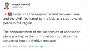 عالیجناب فیلیپ گافین، وزیر امور خارجه بلژیک، در بیانیه ای اظهار داشت: “از نزدیک شدن روابط بین امارات و اسرائیل به عنوان گامی برای صلح در خاورمیانه استقبال می کنم”.